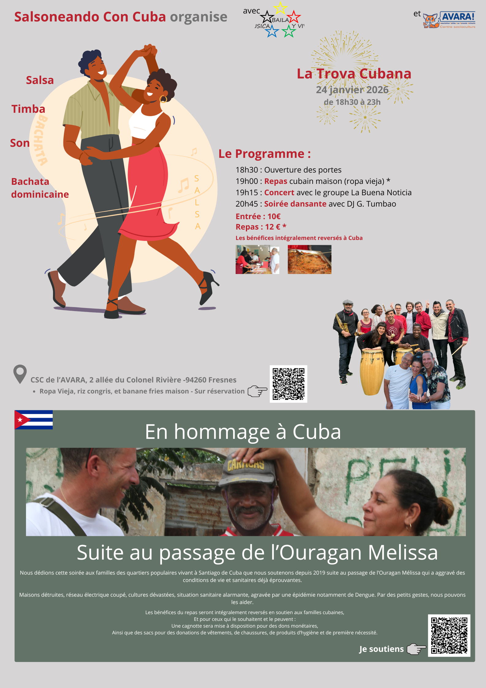Une soirée dansante avec Concert autour d'un repas traditionnel cubain maison en hommage à Cuba, victime du passage de l'Ouragan Melissa dans la nuit du 28 Octobre 2025.